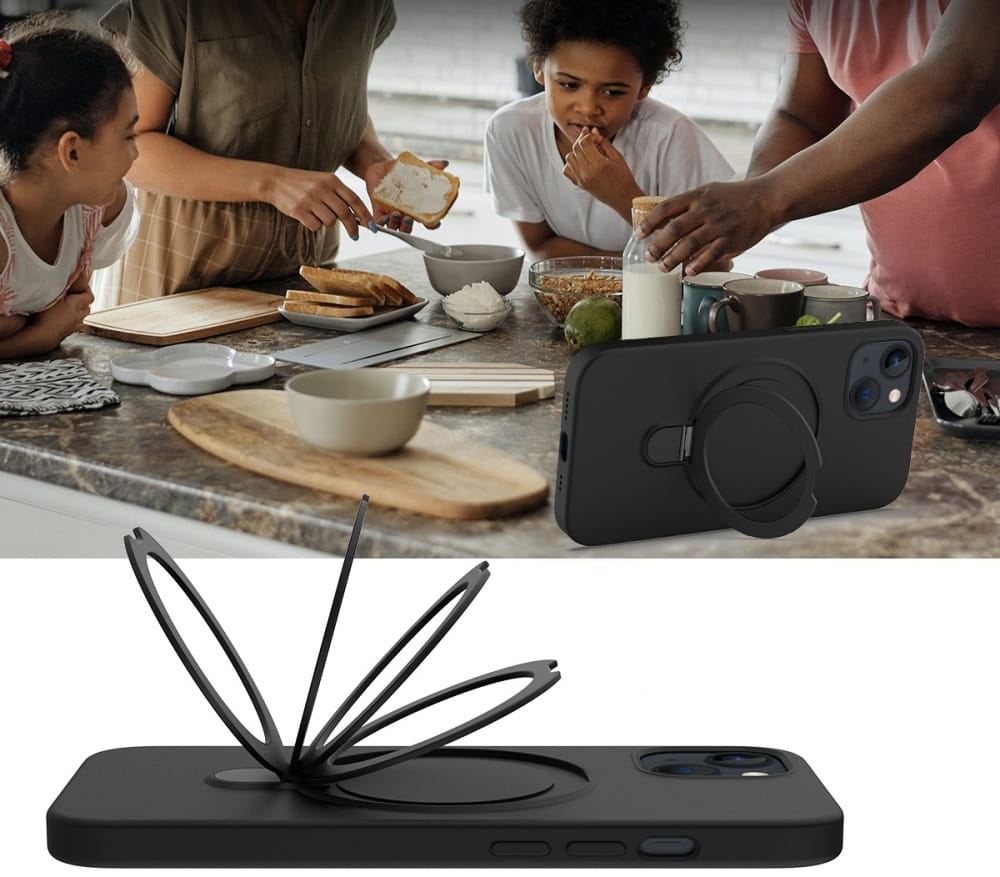 Wbudowany pierścień na palec zwiększa komfort użytkowania oraz bezpieczeństwo podczas trzymania telefonu. Pełni on także funkcję podstawki, umożliwiając wygodne ustawienie urządzenia w pozycji horyzontalnej — idealne do oglądania filmów lub prowadzenia wideorozmów.