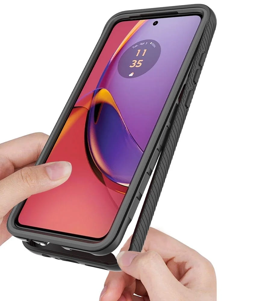 - Antypoślizgowa struktura – Ramka etui posiada teksturowaną, antypoślizgową powierzchnię, która zwiększa pewność chwytu i zapobiega przypadkowemu wyślizgnięciu się telefonu z ręki.