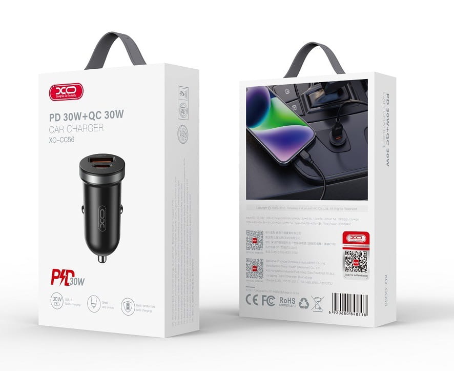 Ładowarka samochodowa XO CC56 - 30W Power Deliver - 2x USB - Czarna