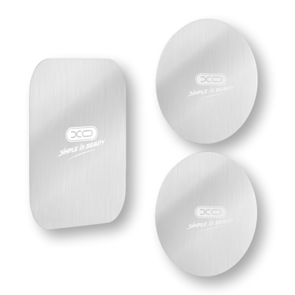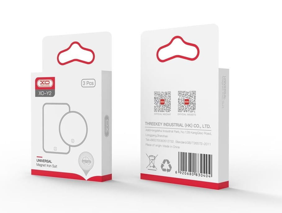 XO Y2 to zestaw jednej prostokątnej i 2 okrągłych metalowych płytek, które po przyklejeniu na obudowę lub etui telefonu, umożliwiają korzystanie z magnetycznych uchwytów samochodowych.